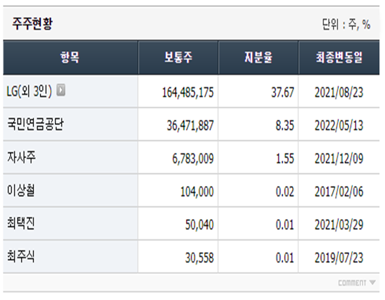 최근 대주주 등의 주주현황을 보여드리는 자료입니다.