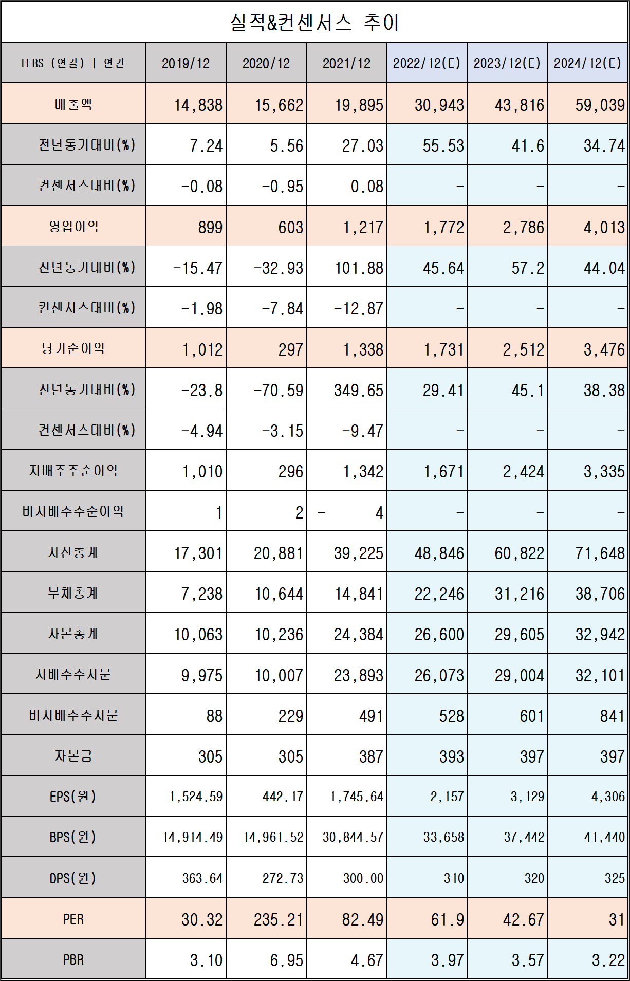 최근 3년과 향후 3년에 대한 기업 재무제표 및 실적&컨센서스 예상 추이입니다.