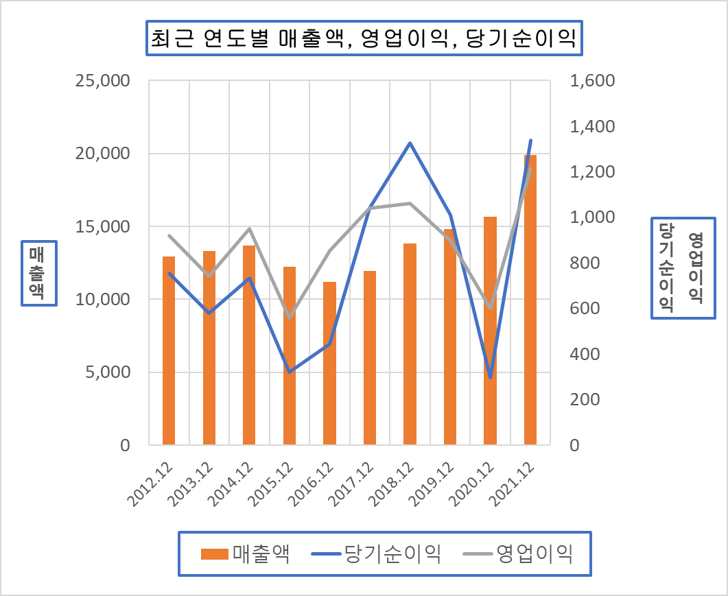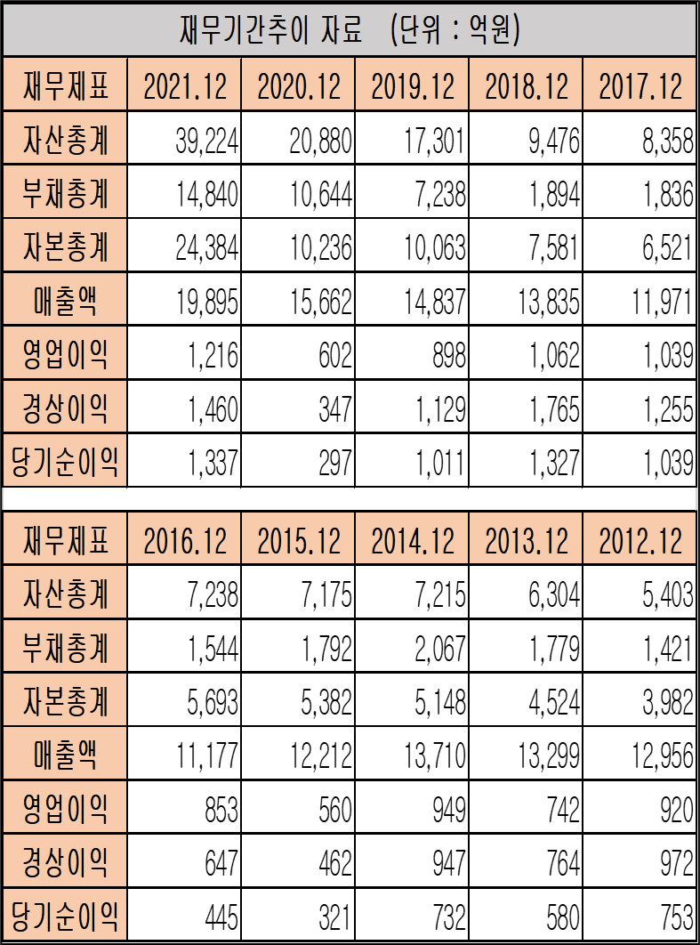 최근 각 연도별로 간략한 재무제표와 실적 등을 보여주는 자료입니다.
