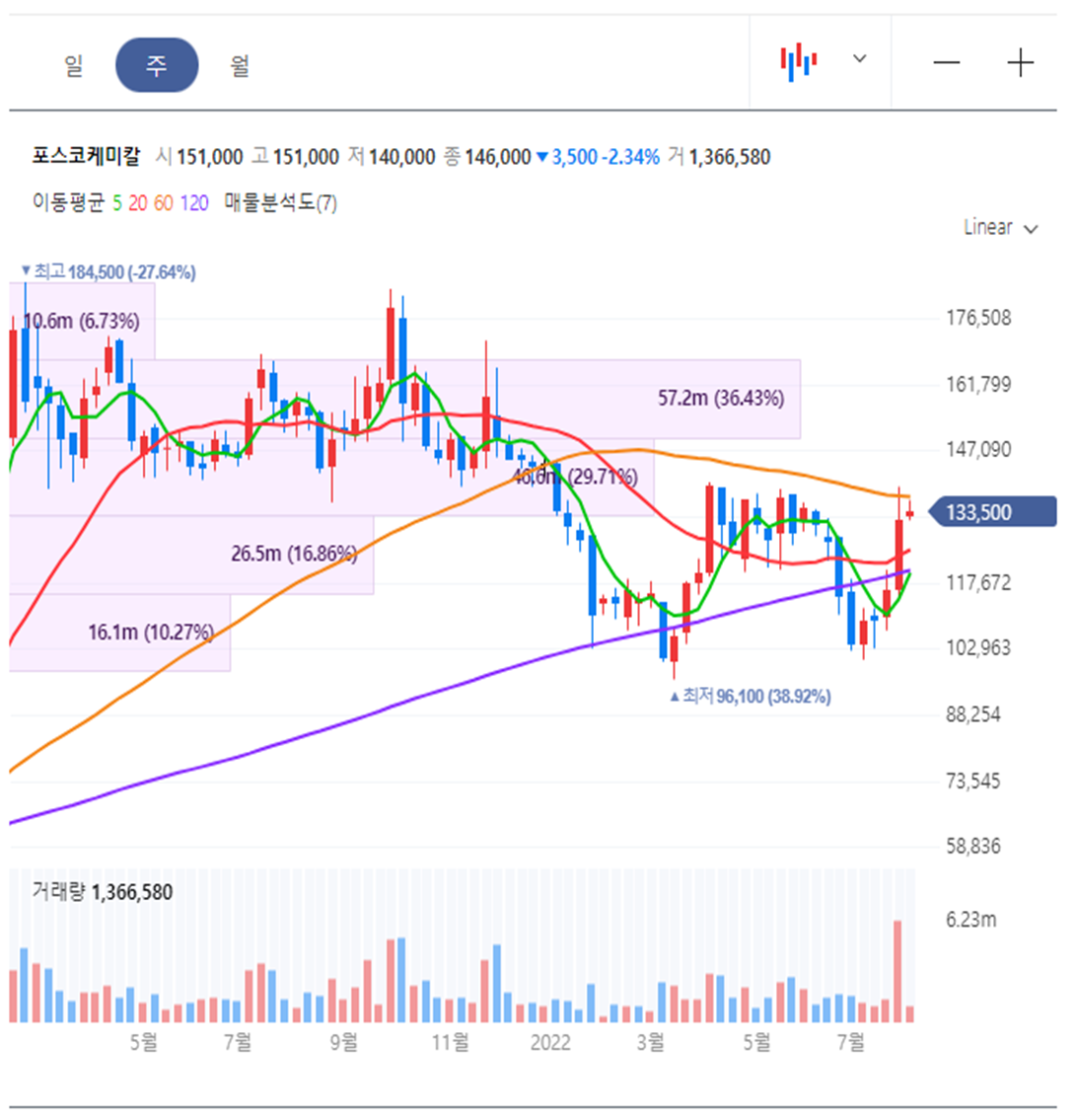 ※ 동사의 주요 사업은 이차전지소재, 첨단화학소재, 산업기초소재로, 이차전지용 양극재와 음극재, 탄소소재 원료와 제품, 내화물과 생석회 등을 제조, 판매함. 포스코그룹 계열의 소재 전문회사로 2021년 약 1조 2천 7백억원의 유상증자를 통해 대규모 투자 재원을 확보함. 이차전지소재 분야에서 포스코 그룹의 리튬, 니켈 등 원료, 이차전지소재연구센터 등 R&D 인프라, 글로벌 마케팅 네트워크를 연계해 사업경쟁력을 높여 나가고 있음.