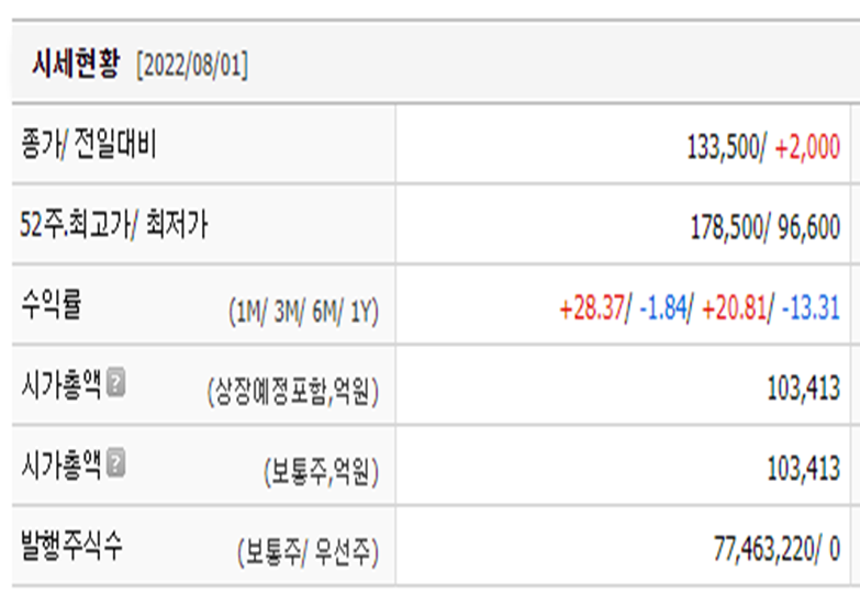 최근 종목 시세 및 시가총액, 발행주식수를 보여드리는 자료입니다.