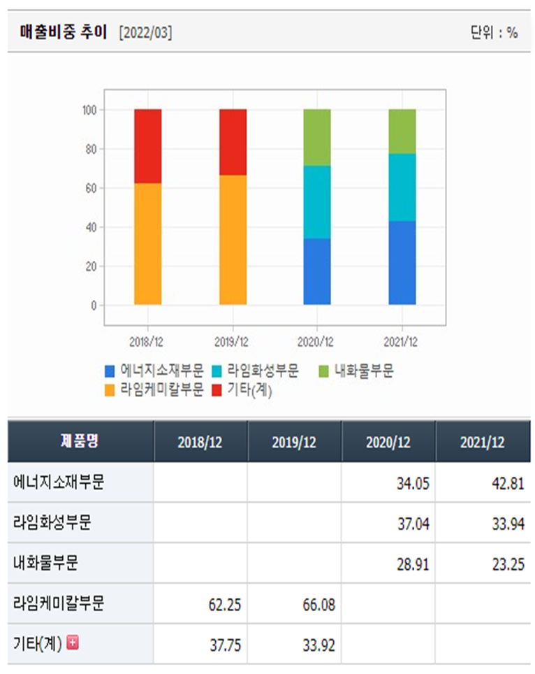 ※ 2022년 3월 전년동기 대비 연결기준 매출액은 42.2% 증가, 영업이익은 25.2% 감소, 당기순이익은 9.3% 감소. 에너지부문을 필두로 주력부문에서 꾸준한 외형 성장세를 기록하고 있으나, 원자재 가격 상승 영향으로 영업수익성은 비교적 크게 하락한 모습. 포스코, OCI 등 대형 거래선을 기반으로 한 안정적 수주를 바탕으로 향후 꾸준한 성장세 계속 유지할 것으로 전망되고 있음.