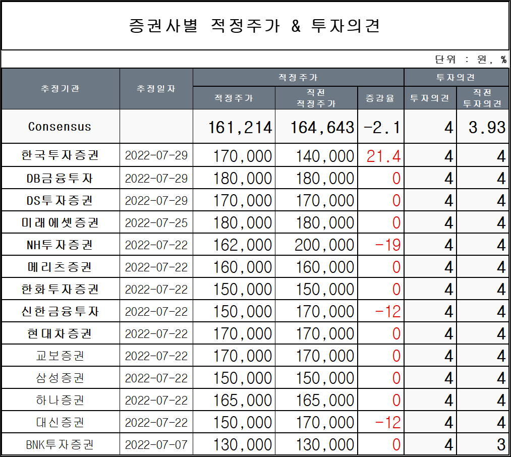 최근 각 증권사 별로 제시한 적정주가 및 투자의견을 보여주는 자료입니다.